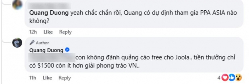 Trong một chia sẻ mới nhất trên mạng xã hội cá nhân, tay vợt sinh năm 2006 đã trả lời thẳng thắn khi được hỏi về kế hoạch tham gia PPA Tour Asia: “Tôi không đánh quảng cáo miễn phí cho Joola. Tiền thưởng chỉ có 1.500 USD (gần 40 triệu đồng), còn ít hơn giải phong trào ở Việt Nam”.