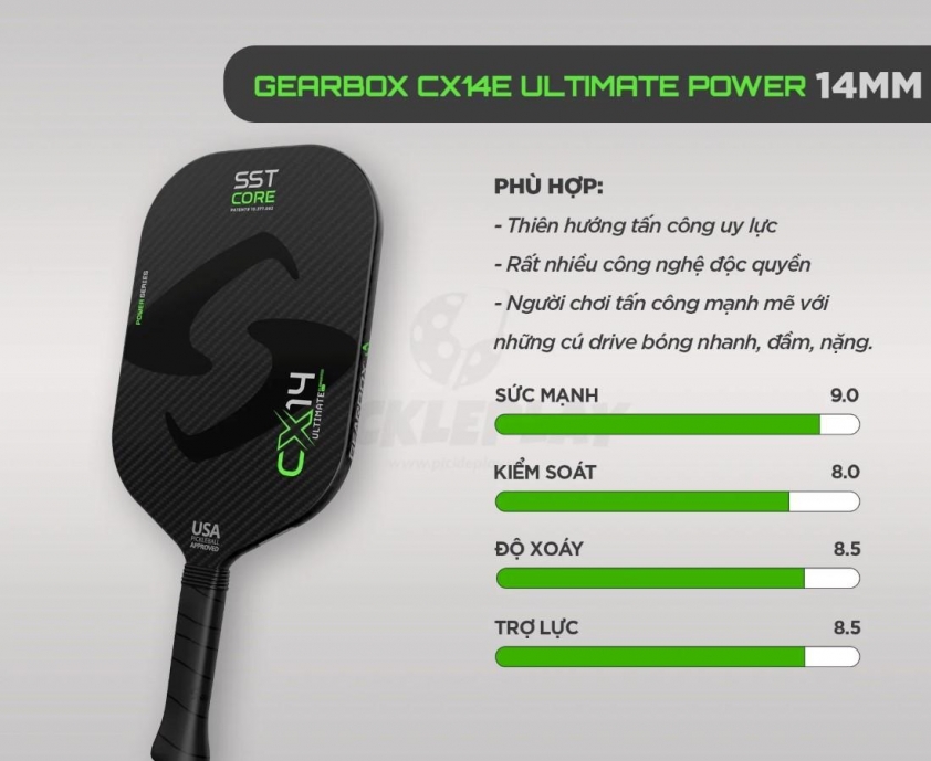 Vợt Gearbox CX14E với thiết kế nguyên khối bằng sợi carbon, độ bền cao và khả năng kiểm soát tinh tế là lựa chọn đáng chú ý cho người chơi trung cấp và chuyên nghiệp.