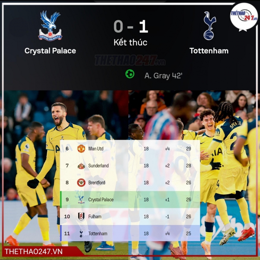 Bàn thắng duy nhất của Archie Gray giúp Tottenham giành trọn 3 điểm trên sân Crystal Palace trong một trận đấu căng thẳng, nơi đội khách phải chịu sức ép lớn suốt hiệp hai.