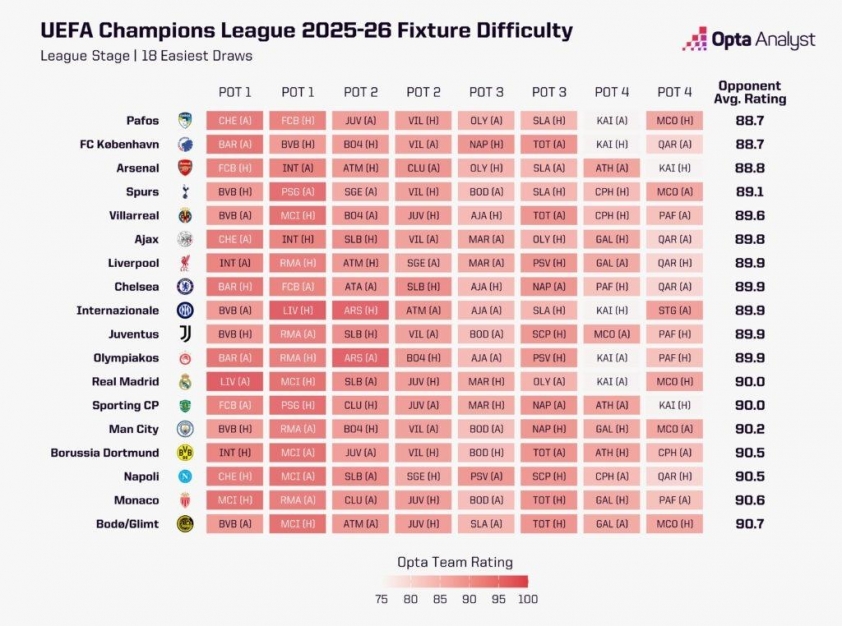 Trong đó thuận lợi nhất là Arsenal. Đoàn quân của Mikel Arteta chỉ phải gặp Olympiacos, Slavia Prague và đặc biệt là Kairat Almaty - nhà vô địch Kazakhstan hiện chỉ xếp hạng 474 thế giới. Nhờ đó, Arsenal được đánh giá là có lịch thi đấu dễ thứ ba trong số 36 đội. Dù bảng đấu còn có những cái tên đáng gờm như Bayern Munich hay Inter Milan, nhưng tổng thể, Pháo thủ vẫn có cơ hội lớn để lọt vào vòng 16 đội mà không cần qua vòng play-off.