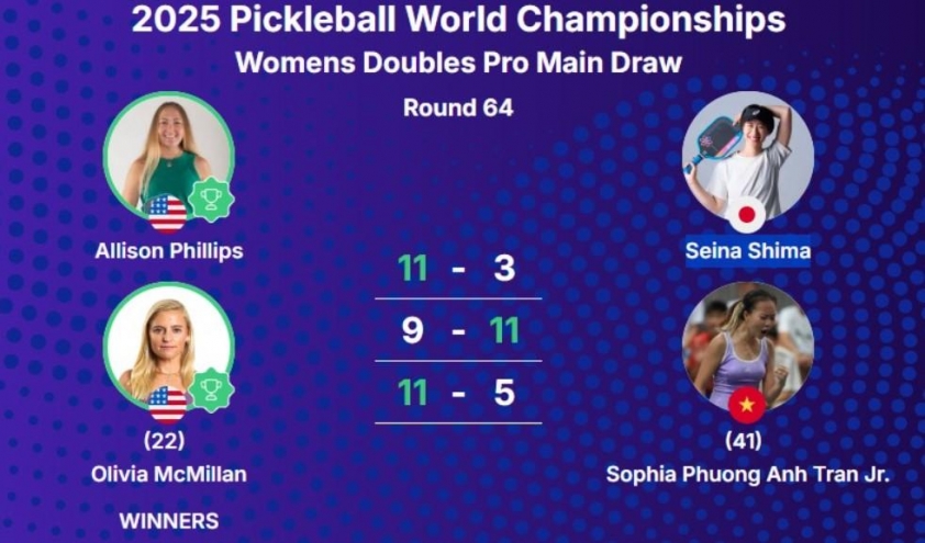 Dù kết quả không như mong đợi, Sophia Phương Anh vẫn rời giải với tư thế ngẩng cao đầu. Hành trình vượt hơn nửa vòng trái đất của cô không chỉ thể hiện tinh thần thi đấu kiên cường, mà còn khẳng định vị thế đang lên của Pickleball Việt Nam trên bản đồ thế giới.
