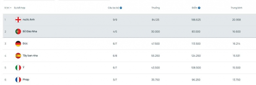 Cách tính của UEFA dựa trên số điểm giành được từ mỗi trận thắng, hòa, cùng các điểm thưởng theo thứ hạng và vòng đấu. Việc nhiều CLB Anh tiến sâu đồng nghĩa số điểm tích lũy tiếp tục tăng mạnh trong các vòng tới. Trong khi đó, các giải khác đã bắt đầu bị loại rải rác, khiến khả năng bứt phá của họ bị hạn chế.