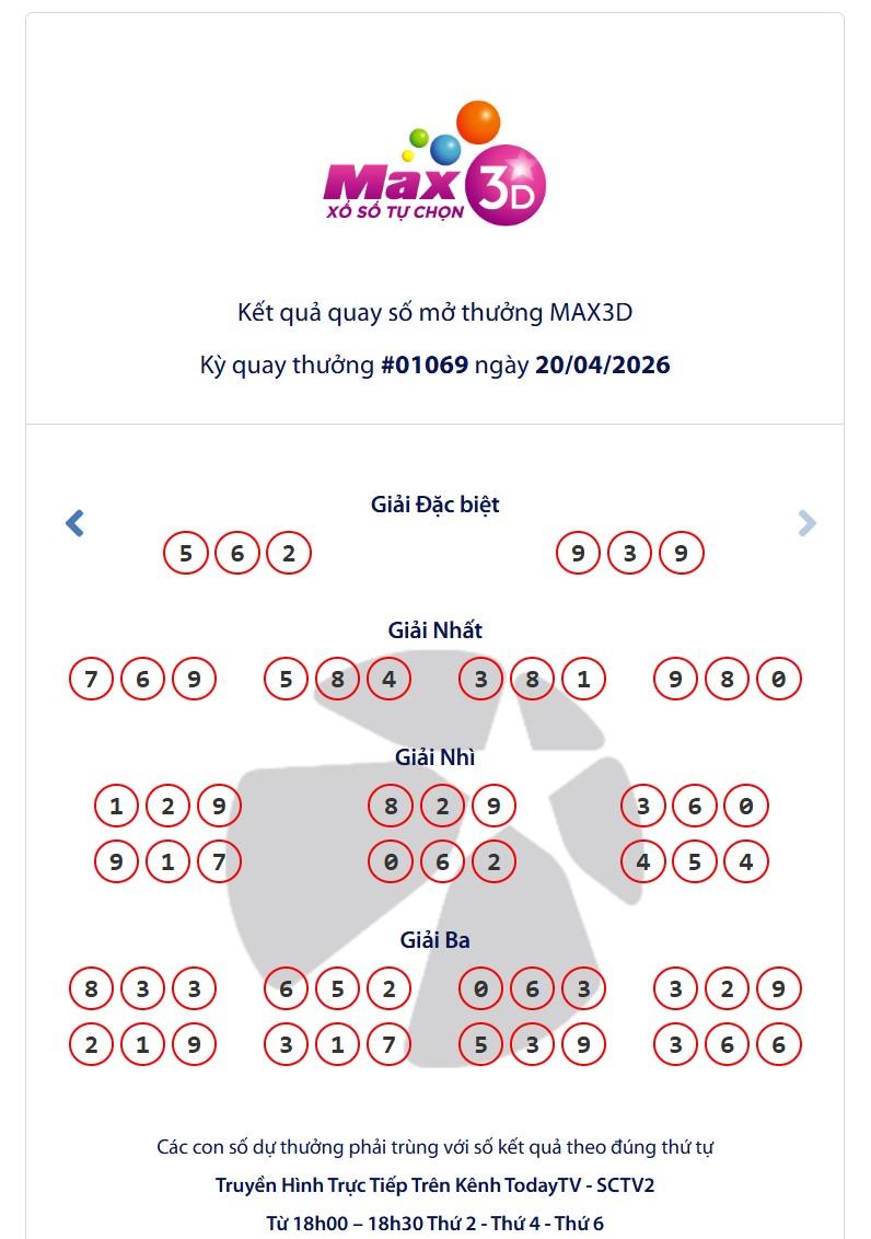 Vietlott 20/4/2026 - Kết quả xổ số Vietlott Max 3D ngày 20/4/2026