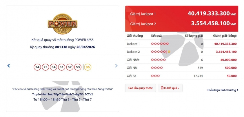 Vietlott 28/4/2026 - Kết quả xổ số Vietlott Power 6/55, Vietlott Max 3D ngày 28/4/2026