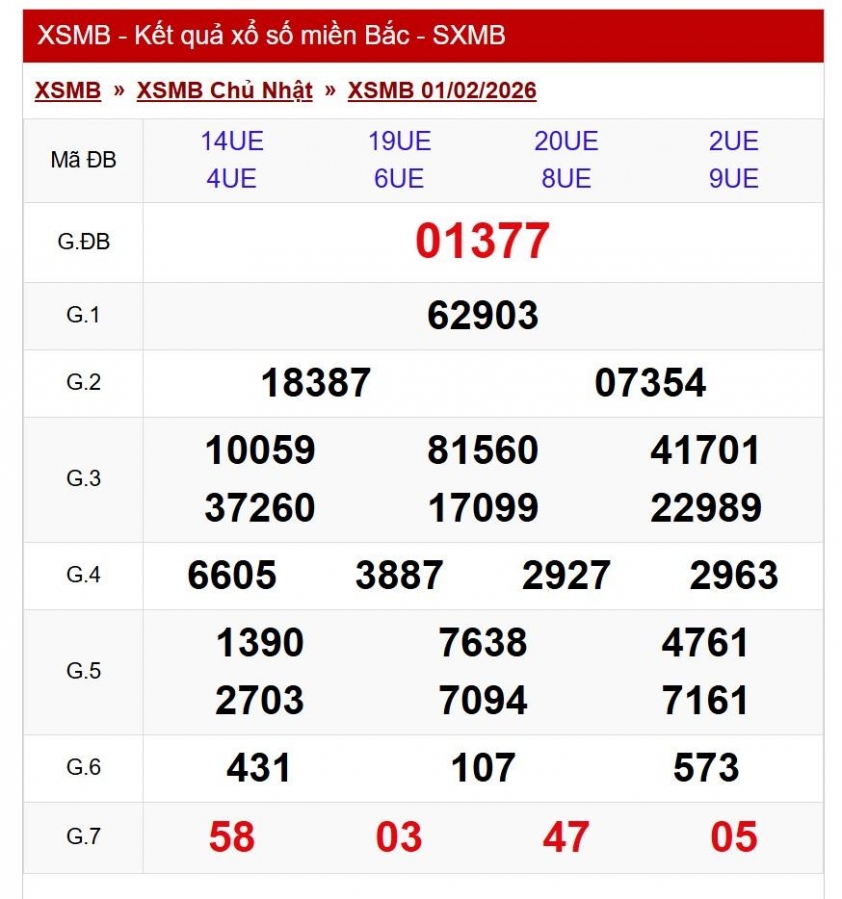 XSMB 1/2/2026 - Kết quả xổ số miền Bắc hôm nay 1/2/2026