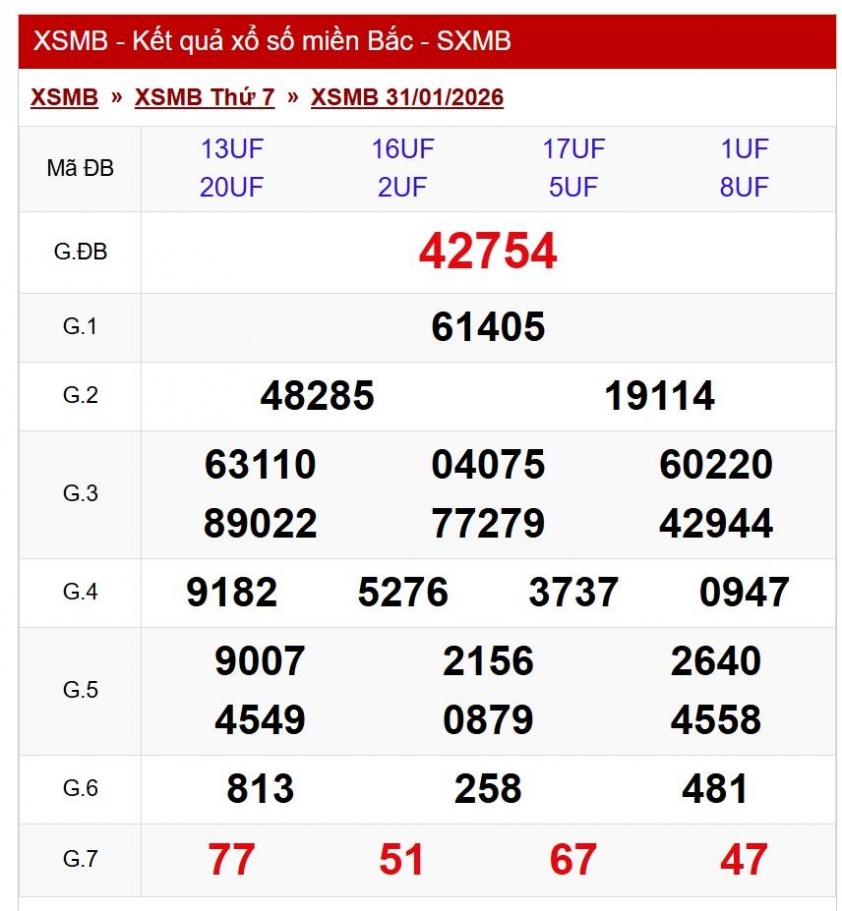 Kết quả xổ số miền Bắc (XSMB) ngày 31/1