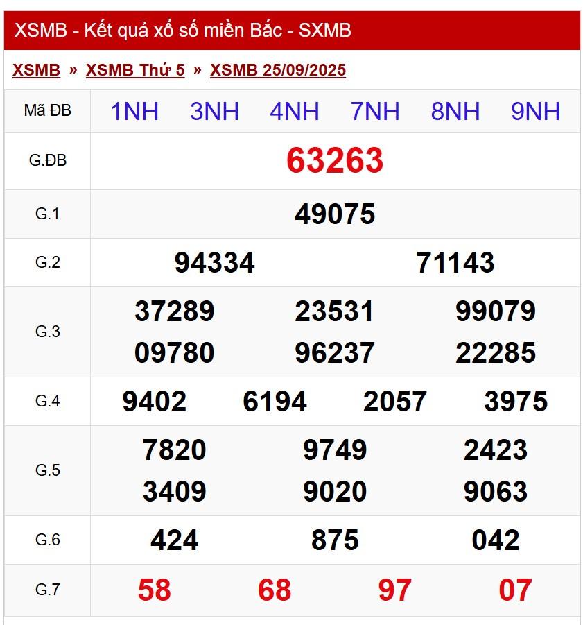 XSMB 25/9/2025 - Kết quả xổ số miền Bắc hôm nay 25/9/2025