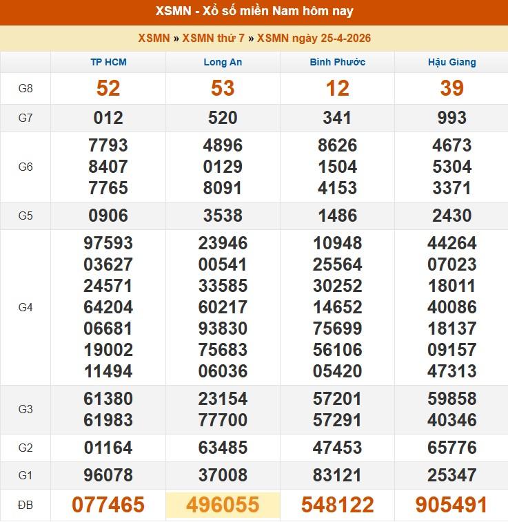 XSMN 25/4/2026 - Kết quả xổ số TP.HCM - Long An - Bình Phước - Hậu Giang hôm nay 25/4/2026