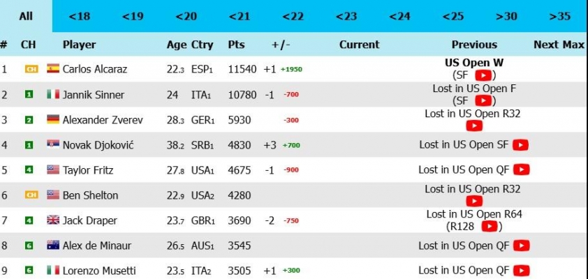 Alcaraz làm được điều này nhờ vào chức vô địch US Open 2025 - giải Grand Slam cuối cùng trong năm sau chiến thắng 3-1 trước Jannik Sinner rạng sáng nay, qua đó soán ngôi của chính đại kình địch. Hiện tại, Alcaraz đang có 11,540 điểm, hơn Sinner 760 điểm trên BXH.