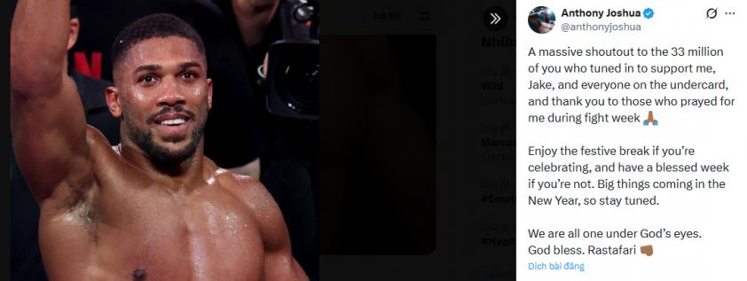 "Một lời cảm ơn chân thành đến 33 triệu người đã theo dõi và ủng hộ tôi, Jake và tất cả các trận đấu phụ, cũng như những người đã cầu nguyện cho tôi trong suốt tuần thi đấu. Chúc mọi người kì nghỉ lễ vui vẻ. Những điều lớn lao sẽ đến trong năm mới, hãy chờ đợi nhé.", Joshua viết trên trang X (trước đây là Twitter) cá nhân.