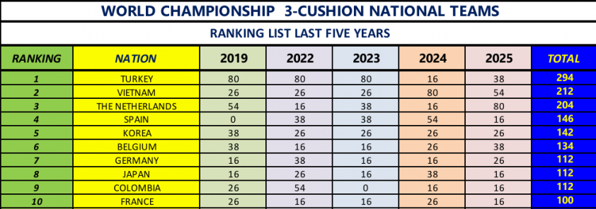 Việc liên tục có thành tích xuất sắc tại Giải Đồng đội thế giới giúp carom 3 băng Việt Nam góp mặt trong top 2 đội tuyển mạnh nhất hành tinh, xếp trên nhiều tên tuổi hàng đầu khác như Hàn Quốc, Tây Ban Nha, Hà Lan, Bỉ, Pháp hay Thụy Điển.