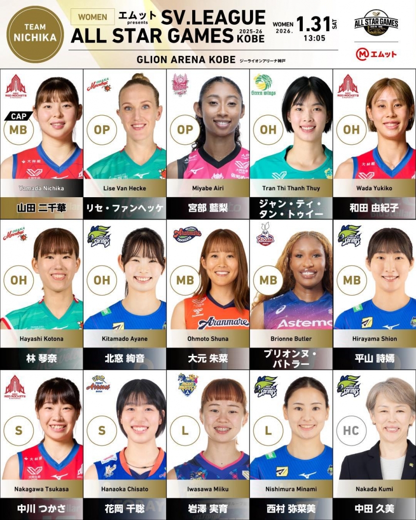 Trần Thị Thanh Thúy (hàng trên cùng, thứ 2 từ phải vào) sẽ thi đấu cho đội Nichika tại sự kiện SV.League All Star Games mùa này.