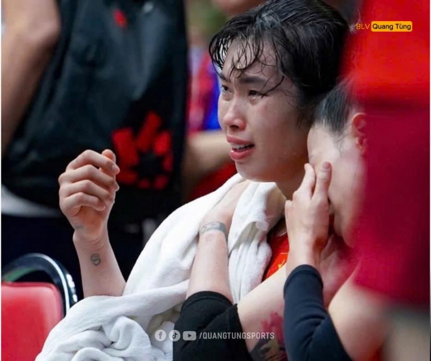 Thanh Thúy và đối chuyền Hoàng Thị Kiều Trinh sau đó đã khóc nức nở ở hàng ghế VĐV, hình ảnh khiến nhiều người hâm mộ Việt Nam không khỏi xót xa.