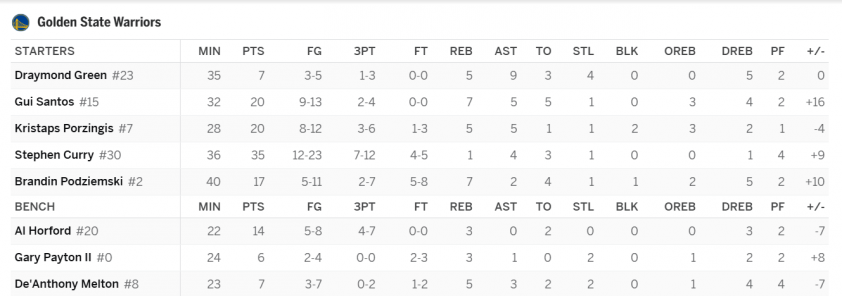 Ngoài Curry, một nhân tố khác cũng góp công rất lớn giúp GSW có chiến thắng quý giá là trung phong kì cựu Al Horford với 3 cú ném ba điểm thành công đầy cảm giác. Trước đó, "Kì lân" Kristaps Porzingis hay Gui Santos đều có màn thể hiện xuất sắc với cùng 20 điểm ghi được.