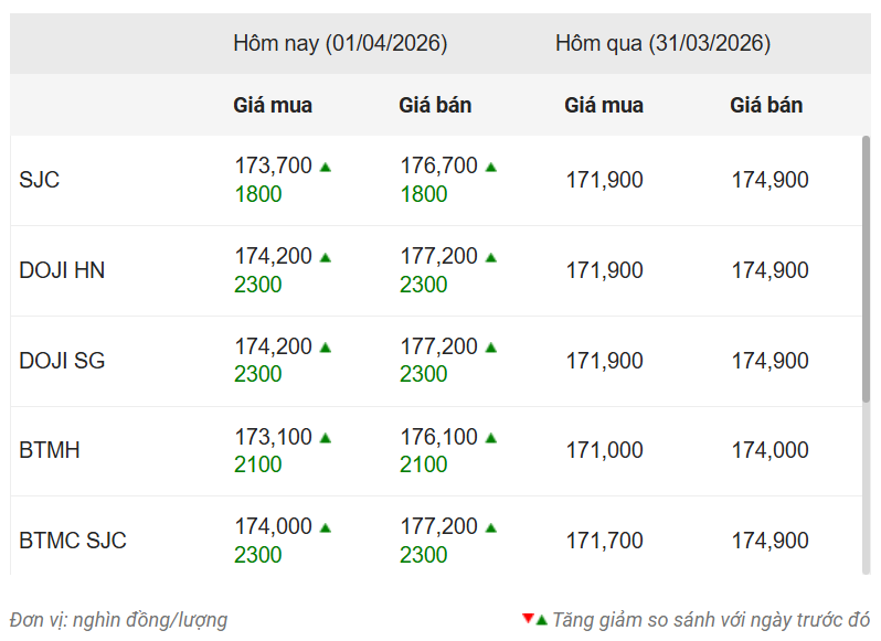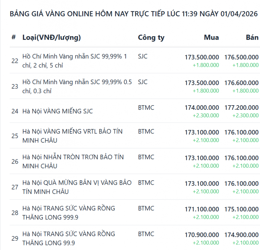 Tương tự, các thương hiệu vàng lớn như Bảo Tín Mạnh Hải, Bảo Tín Minh Châu cũng điều chỉnh tăng mạnh. BTMH hiện đang giao dịch trong khoảng 173,1-176,1 triệu đồng/lượng, tăng mạnh 2,1 triệu đồng ở cả hai chiều. BTMC niêm yết cao hơn, hiện ở mức 174-177,2 triệu đồng/lượng, tăng 2,3 triệu đồng so với ngày hôm qua.