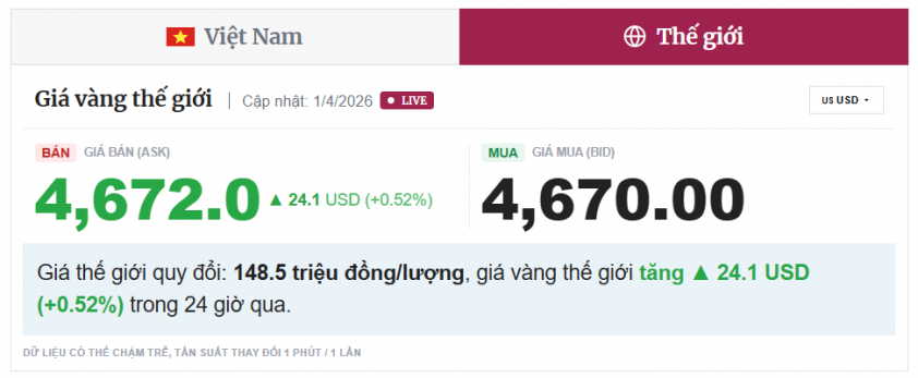 Theo dữ liệu mới nhất, giá vàng thế giới hiện đang niêm yết ở mức 4,670 USD/ounce chiều mua vào và 4,672 USD/ounce chiều bán ra, tăng 24.1 USD/ounce trong 24 giờ qua.