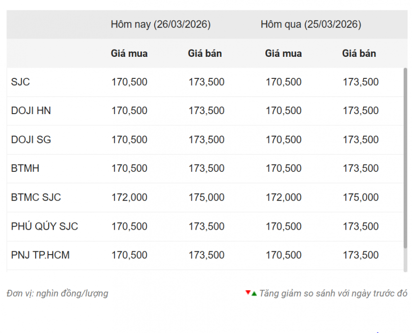 Tính tới 10h00, giá vàng trong nước đã hạ nhiệt so với những diễn biến trong các ngày gần đây. Vàng SJC hiện đang niêm yết ở mức 170,5 triệu đồng/lượng (chiều mua vào) và 173,5 triệu đồng/lượng (chiều bán ra), giảm 1,5 triệu đồng/lượng ở cả hai chiều so với cùng giờ ngày 25/3.