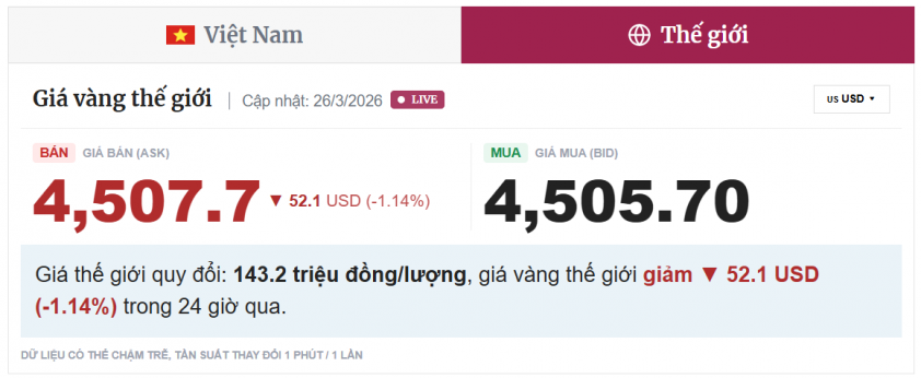 Theo dữ liệu mới nhất, giá vàng thế giới hiện đang niêm yết ở mức 4,505.70 USD/ounce chiều mua vào và 4,507.7 USD/ounce chiều bán ra, giảm 52.1 USD trong 24 giờ qua.