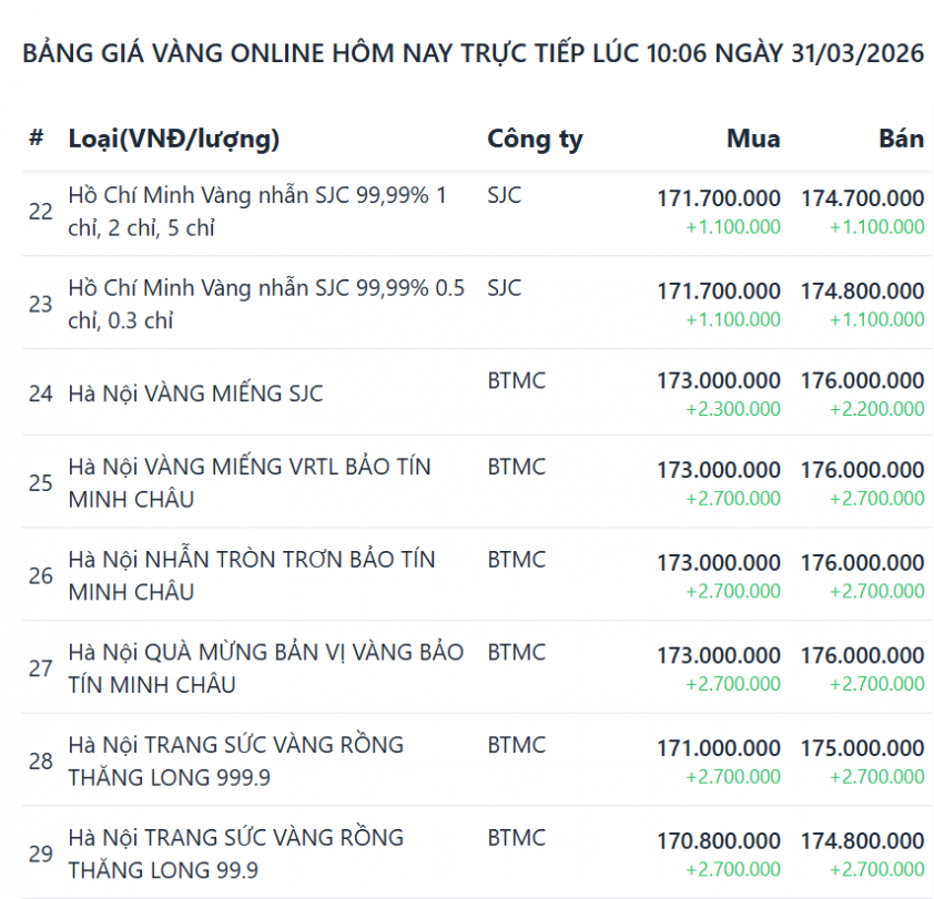 Tương tự, các thương hiệu vàng lớn như Bảo Tín Mạnh Hải, Bảo Tín Minh Châu cũng điều chỉnh tăng mạnh. BTMH hiện đang giao dịch trong khoảng 173-176 triệu đồng/lượng, tăng mạnh 2,7 triệu đồng ở cả hai chiều. BTMC cũng niêm yết mức giá tương tự, lần lượt tăng 2,3 triệu và 2,2 triệu ở chiều mua vào và bán ra.