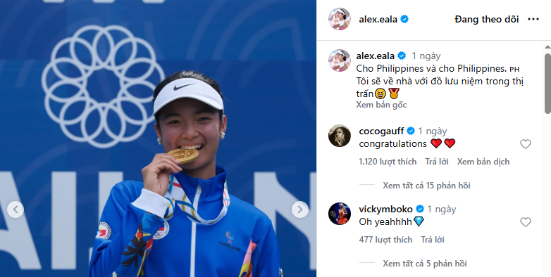 Ở phần bình luận, Coco Gauff - tay vợt đang xếp hạng 3 thế giới, từng giành 2 Grand Slam: US Open 2023 và Roland Garros 2025 đã để lại lời chúc mừng ngắn gọn nhưng đầy ý nghĩa. Bên cạnh đó, Victoria Mboko - tay vợt trẻ đang xếp hạng 18 thế giới cũng dành cho Eala lời khen ngợi, thể hiện sự ghi nhận của giới chuyên môn đối với thành tích mà tay vợt Philippines đạt được. Những phản hồi từ các ngôi sao hàng đầu càng làm nổi bật giá trị tấm HCV SEA Games của cựu học viên lò Rafa Nadal.