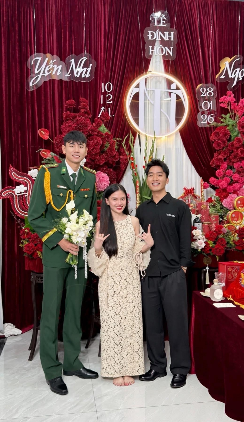Không chỉ tỏa sáng trên sân bóng, Ngọc Thuân và Duy Tuyến còn ghi dấu ấn đậm nét trong lễ đính hôn với sự hiện diện của đông đảo người thân, bạn bè. Được biết "người thương" của chủ công sinh năm 1999 tên Yến Nhi, quê ở Quảng Ngãi. Khoảng cách địa lí xa xôi không thể ngăn cách được tình yêu đẹp giữa bộ đôi trai tài - gái sắc này.