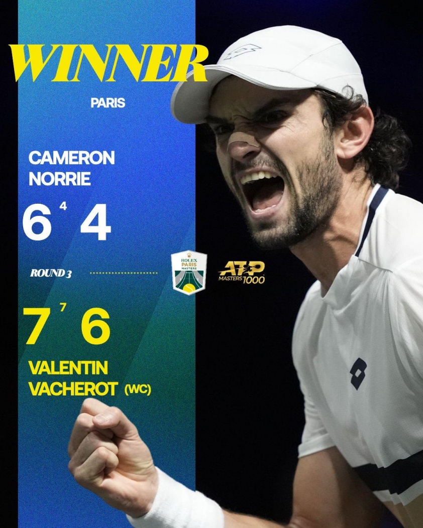 Hiện tượng thú vị của tennis thế giới chặng cuối mùa giải 2025 - Valentin Vacherot giành quyền vào tứ kết giải ATP 1000 Paris Masters sau thắng lợi 7-6; 6-4 trước Cameron Norrie chiều tối nay 30/10 theo giờ Việt Nam.