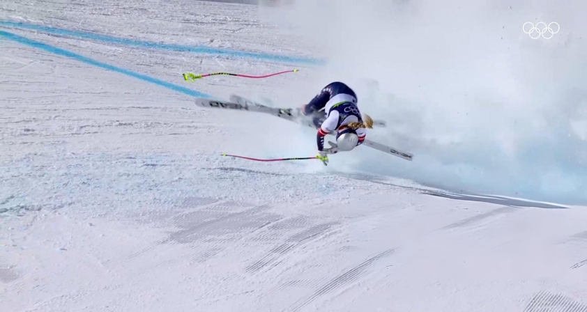 Mang số áo 13 và đeo nẹp đầu gối, Lindsey Vonn xuất phát với tinh thần đầy phấn khích. Tuy nhiên, ở cổng thứ 4, cô dường như va chạm mạnh, mất kiểm soát và bị hất tung lên không trung trước khi trượt khỏi đường đua ở tốc độ rất cao. Tiếng la hét đau đớn của Vonn vang lên trên sóng truyền hình, khiến khán giả, đồng đội và giới chuyên môn không khỏi bàng hoàng.