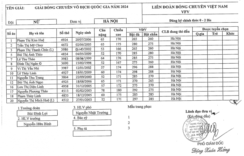 Danh sách cầu thủ Hà Nội giai đoạn 2 giải bóng chuyền nữ VĐQG 2024