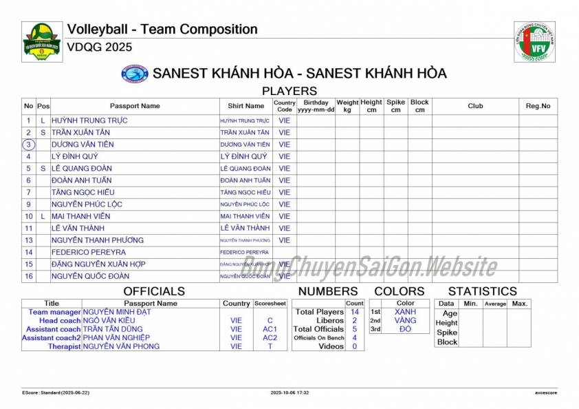 Danh sách cầu thủ Sanest Khánh Hòa giai đoạn 2 giải bóng chuyền VĐQG 2025