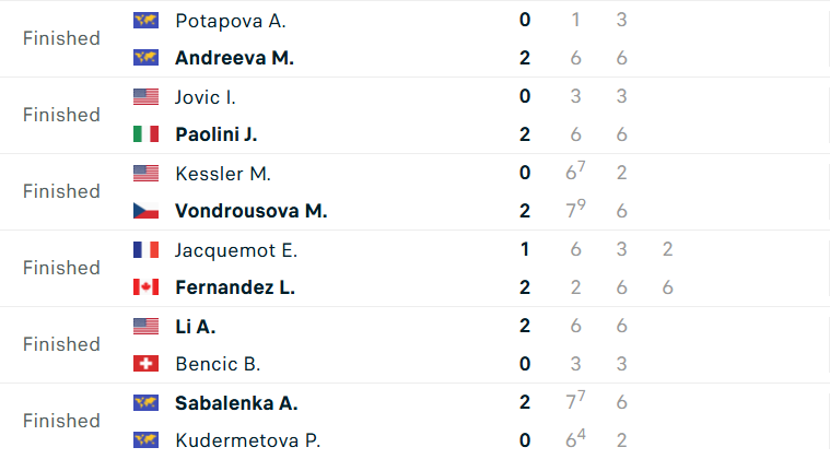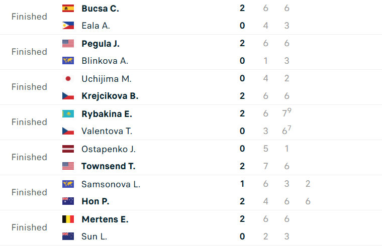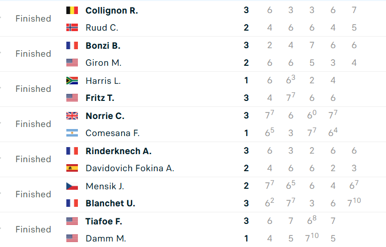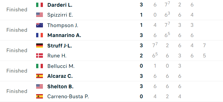 Trong khi đó, Carlos Alcaraz khẳng định sức mạnh với chiến thắng đậm đà trước tay vợt người Ý Mattia Bellucci. Một số gương mặt đáng chú ý có được kết quả thuận lợi còn có Ben Shelton, Taylor Fritz, Frances Tiafoe, Aryna Sabalenka, Mirra Andreeva hay Elena Rybakina, v.v.