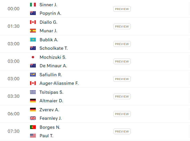 Trong khi đó, Alexander Zverev dự báo sẽ dễ dàng đi tiếp trước đối thủ Jacob Fearnley, còn Stefanos Tsitsipas hứa hẹn sẽ có trận đấu giông bão trước Daniel Altmaier - tay vợt có sức bền tuyệt vời, không ngán điều kiện thời tiết khắc nghiệt cũng như khi trận đấu phải trôi vào set 5.