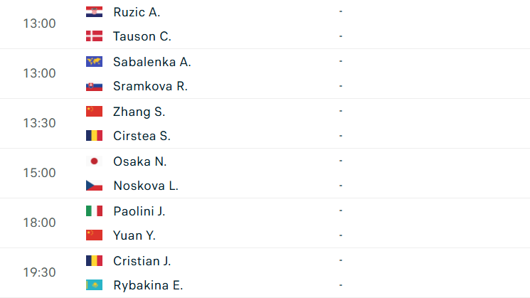 Lịch thi đấu WTA Vũ Hán - Vòng 1/16