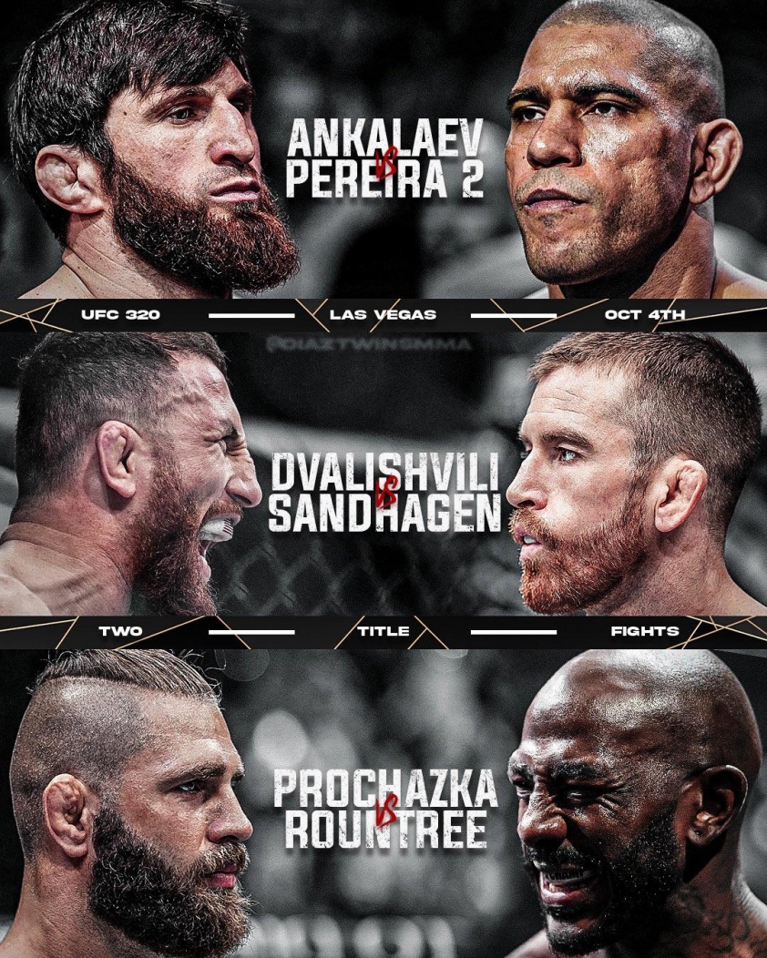 Tâm điểm của UFC 320 sẽ là hai trận đấu đồng chính thức: trận bảo vệ đai hạng dưới nặng của Magomed Ankalaev trước Alex Pereira và trận bảo vệ đai hạng gà của Merab Dvalishvili với kẻ thách thức Cory Sandhagen. Trong đó, trận tái đấu giữa Ankalaev và Pereira được chờ đợi hơn cả và đã sớm được hâm nóng với những màn khẩu chiến cực "gắt" giữa đôi bên.