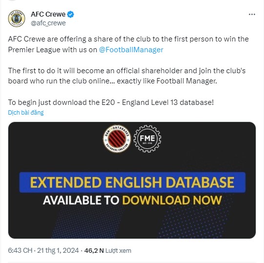 Vào tối ngày hôm qua (21/1) theo giờ Việt Nam, trang X (trước đây là Twitter) chính thức của câu lạc bộ AFC Crewe đã đăng tải thông tin thu hút được sự quan tâm lớn của người yêu thích tựa game Football Manager (FM).