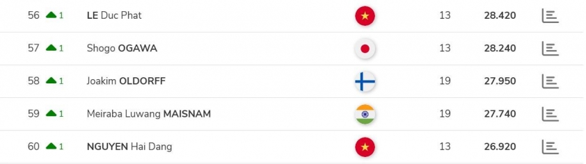 Như vậy, với việc Hải Đăng tăng hạng trên BXH thế giới, cầu lông nam Việt Nam đang có hai tay vợt nằm trong top 60. Lê Đức Phát cũng tăng một bậc so với tuần trước, vươn lên xếp thứ 56 với 28,420 điểm tích lũy.