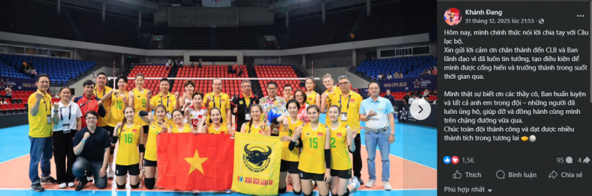 Libero Nguyễn Khánh Đang đã chia tay đội bóng chuyền nữ VTV Bình Điền Long An sau khi hai bên không đạt được thỏa thuận gia hạn hợp đồng, khép lại một chương đáng nhớ trong sự nghiệp thi đấu đỉnh cao của mình.
