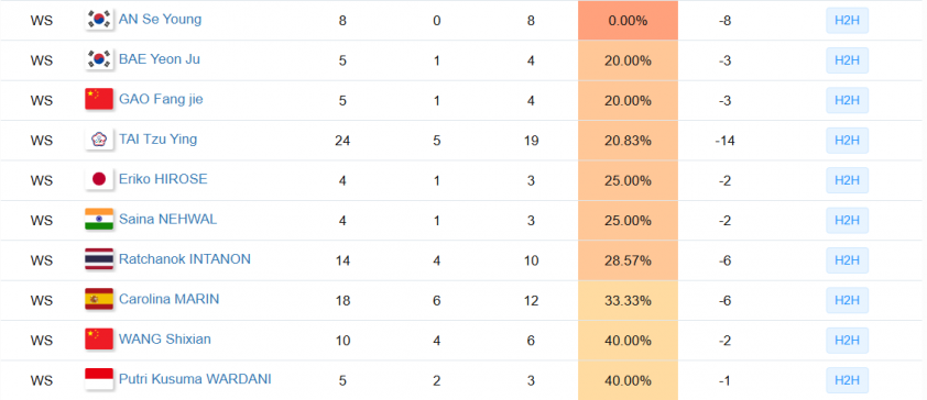 Cơn "ác mộng" lớn nhất sự nghiệp PV Sindhu là An Se-young khi tay vợt người Ấn Độ để thua ở cả 8 lần đối đầu. Ngoài ra, Sindhu còn có tỉ lệ thắng rất khiêm tốn trước Tai Tzu-ying (5-19), Ratchanok Intanon (4-10), Carolina Marin (6-12), Gao Fangjie (1-4) hay He Bingjiao (9-12), v.v.