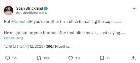 Không có gì ngạc nhiên khi Sean Strickland thẳng thắn nói về tình trạng pháp lí rắc rối mà Jamahal Hill vướng phải. Trên trang X (trước đây là Twitter) cá nhân, võ sĩ có biệt danh "Tarzan" chia sẻ: