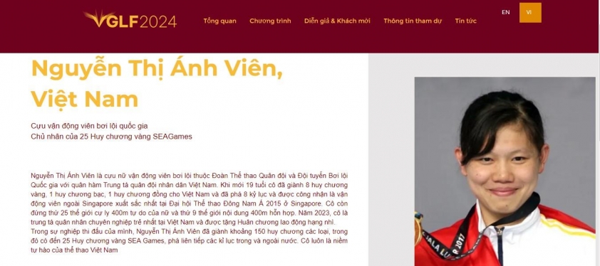 Sau khi giải nghệ, Ánh Viên trở thành giáo viên dạy bơi, hoàn thành chương trình học bậc Đại học, làm Sứ giả Quỹ Nhi đồng Liên Hợp Quốc (UNICEF) và trở thành Trung tá quân nhân trẻ nhất Việt Nam. Việc Ánh Viên có mặt ở sự kiện VGLF 2024 là hoàn toàn xứng đáng.