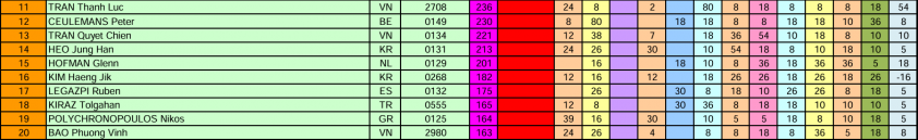| Thứ hạng | Thứ hạng UMB | VĐV |