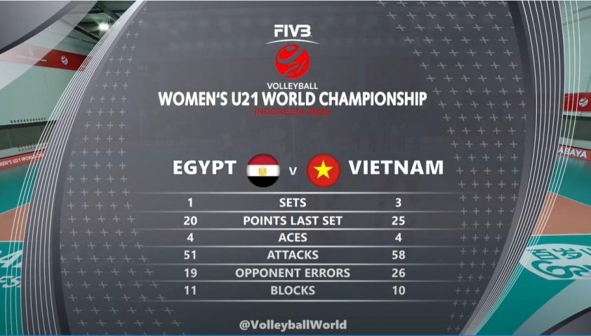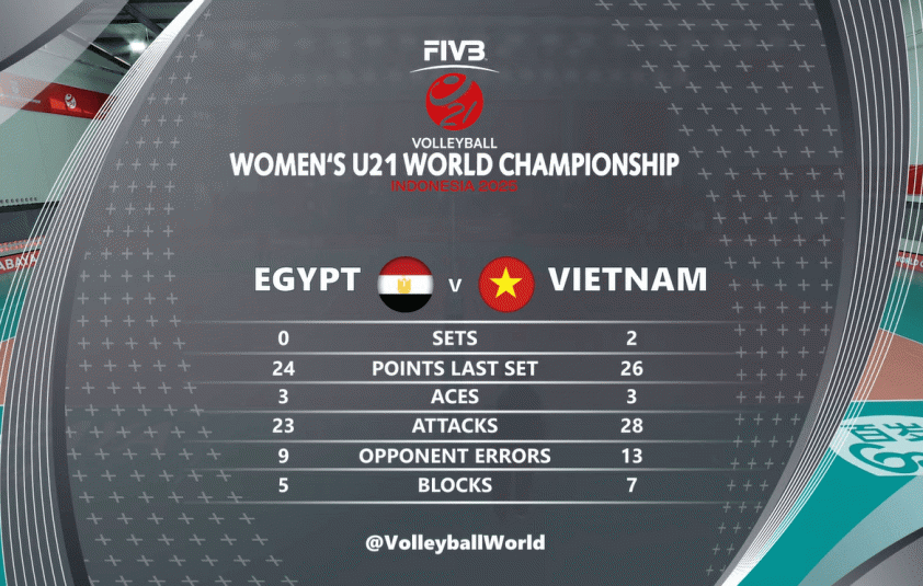 Khả năng phát bóng cũng cân bằng khi cả hai đội đều có 4 cú ace, nhưng Việt Nam tận dụng tốt hơn các sai lầm của Ai Cập (26 lỗi so với 19). Hàng chắn của hai đội thi đấu ấn tượng, Việt Nam có 10 block và Ai Cập nhỉnh hơn với 11. Chiến thắng ở set quyết định thể hiện bản lĩnh và sự bền bỉ của các cô gái trẻ Việt Nam, khép lại trận đấu đầy cảm xúc trước đối thủ đến từ châu Phi.