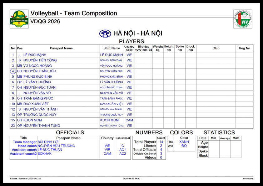 Danh sách VĐV Hà Nội vòng 1 giải bóng chuyền VĐQG các CLB 2026