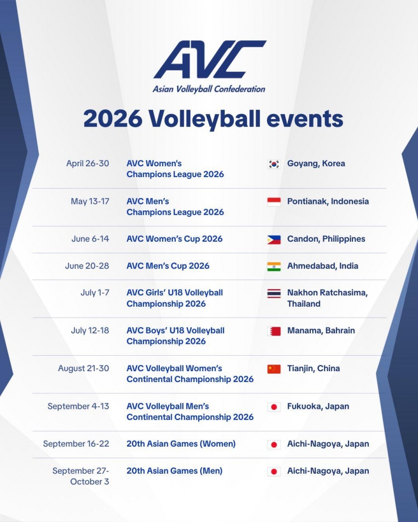 AVC (Liên đoàn Bóng chuyền châu Á) đã công bố lịch trình các giải đấu lớn dưới sự quản lí của tổ chức này trong năm 2026 tới đây. Một mùa giải hứa hẹn bận rộn dành cho đội tuyển bóng chuyền nữ Việt Nam.