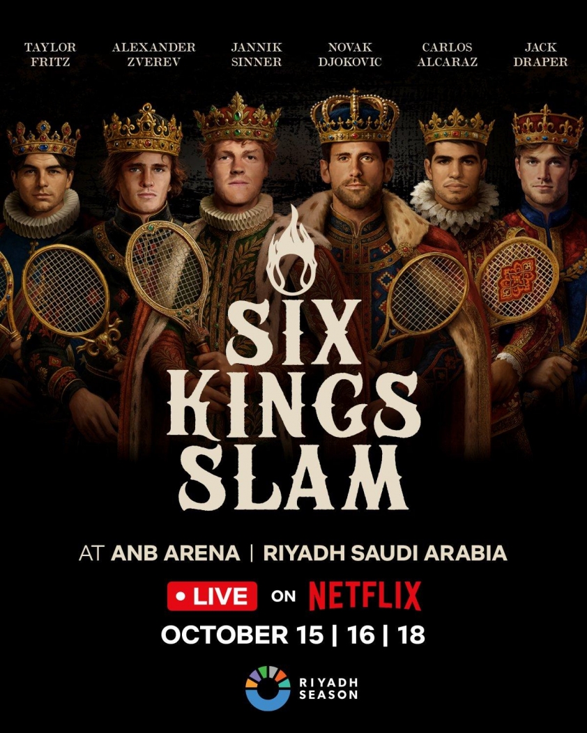 Giải tennis giao hữu Six Kings Slam 2025 sẽ diễn ra từ ngày 15/10 đến 18/10 tại Riyadh, Ả Rập Xê Út, là một phần của "Mùa giải Riyadh" gồm các môn thể thao như tennis, bóng đá, boxing, đấu vật biểu diễn, v.v. Sự kiên này quy tụ 6 anh tài hàng đầu làng banh nỉ thế giới: Novak Djokovic, Carlos Alcaraz, Jannik Sinner, Alexander Zverev, Taylor Fritz và Stefanos Tsitsipas.