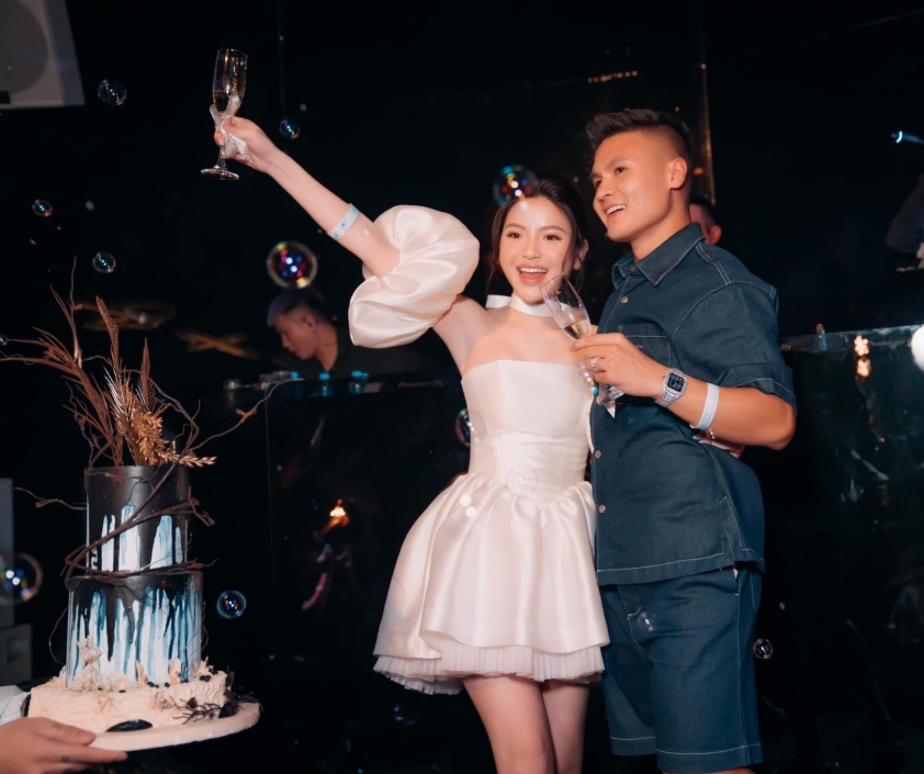 Sau khi khép lại hôn lễ viên mãn, cặp đôi Quang Hải - Chu Thanh Huyền cùng bạn bè tiếp tục cuộc vui đến tận khuya tại quán bar. Trong loạt ảnh mới đăng tải, cô dâu chú rể trao nhau những nụ hôn ngọt ngào và thoải mái thể hiện tình cảm trước đám đông. Lúc này, cả hai đã thay bỏ trang phục cưới cầu kỳ, mặc đồ giản dị để có thể vui chơi thoải mái. Thanh Huyền diện đầm trắng xinh xắn cùng giày bệt trong khi Quang Hải mặc đồ jean và giày thể thao. Dù đang mang thai nhưng hot girl vẫn hòa mình vui chơi cùng bạn bè đến tận khuya.