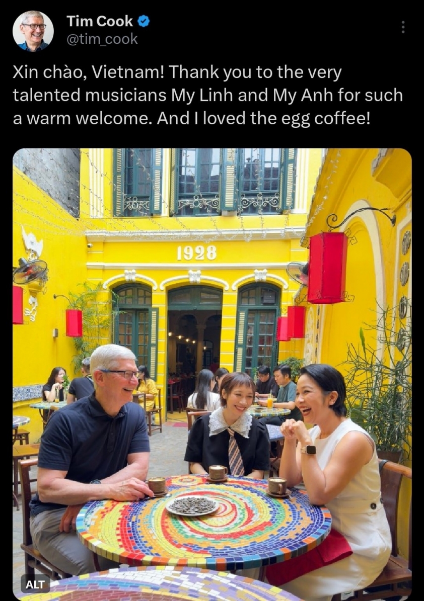 Sáng 15/4, ông Tim Cook - Giám đốc điều hành (CEO) của Apple đã có mặt tại Hà Nội, bắt đầu chuyến công tác 2 ngày tại Việt Nam. Ông Tim Cook đáp xuống sân bay Nội Bài bằng chuyên cơ riêng và ngay lập tức có mặt tại một quán cà phê nổi tiếng để thưởng thức món uống đặc sản cùng ca sĩ hàng đầu Việt Nam.