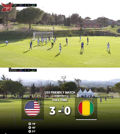 Trận đấu diễn ra vào ngày 22 tháng 3 năm 2024, chỉ hơn một tháng trước khi U23 Guinea đối đầu với U23 Indonesia. U23 Mỹ đã thể hiện sự vượt trội và có được chiến thắng thuyết phục với các bàn thắng của Harriel (phút thứ 9), Busio (phút 45+1) và Gomez (phút 51).