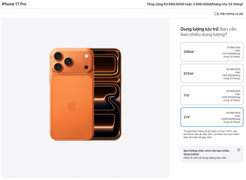 Đặc biệt, năm nay iPhone 17 Pro Max lần đầu tiên có phiên bản 2TB với giá 64 triệu đồng – mức giá cao nhất Apple từng áp dụng cho một mẫu iPhone.