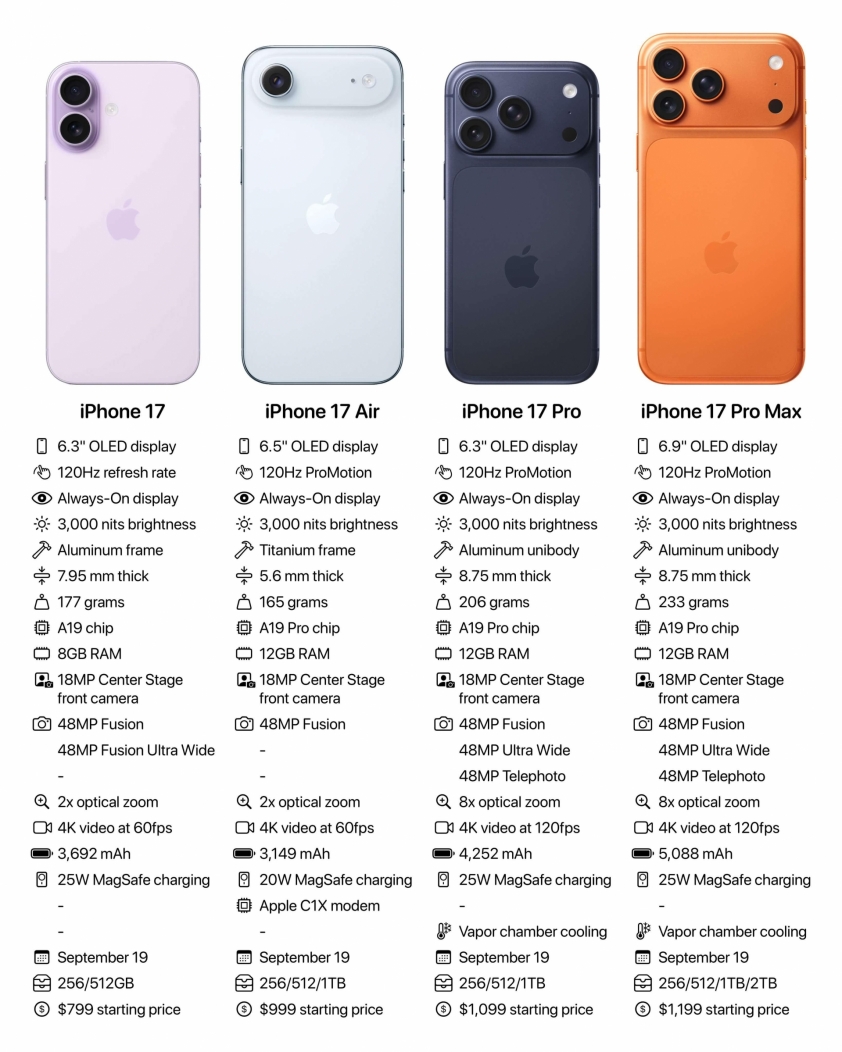 Bộ đôi iPhone 17 Pro và 17 Pro Max có ba màu bạc, cam vũ trụ và xanh đậm. iPhone 17 Pro được bán với giá 35 triệu đồng cho bản 256GB, 41,5 triệu đồng cho bản 512GB và 48 triệu đồng cho bản 1TB. iPhone 17 Pro Max khởi điểm từ 38 triệu đồng cho bản 256GB, cao hơn 3 triệu đồng so với iPhone 16 Pro Max khi ra mắt.