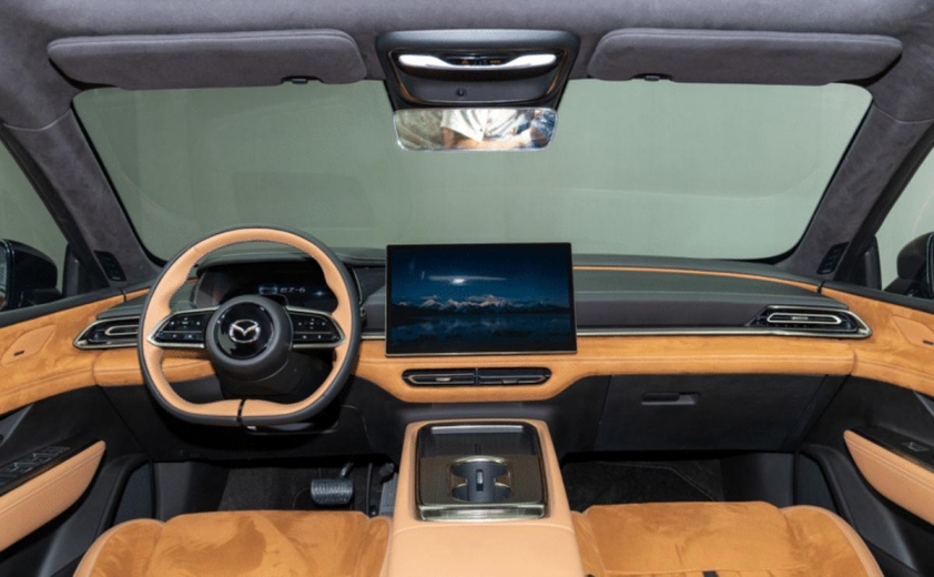 Bước vào bên trong, nội thất của EZ-6 là sự giao thoa giữa công nghệ hiện đại và sự tối giản đặc trưng của Mazda. Màn hình trung tâm nổi 14,6 inch kết hợp với bảng đồng hồ kỹ thuật số 10,1 inch và kính lái hiển thị thông tin AR-HUD 50 inch mang đến trải nghiệm hiển thị trực quan, cao cấp. Hệ thống giải trí vận hành trên nền tảng chipset Qualcomm 8155, trang bị âm thanh Sony 14 loa, đèn viền nội thất 64 màu, ghế trước có chế độ không trọng lực và hàng loạt tiện nghi cao cấp như cửa sổ trời toàn cảnh, điều khiển bằng giọng nói bốn vùng.